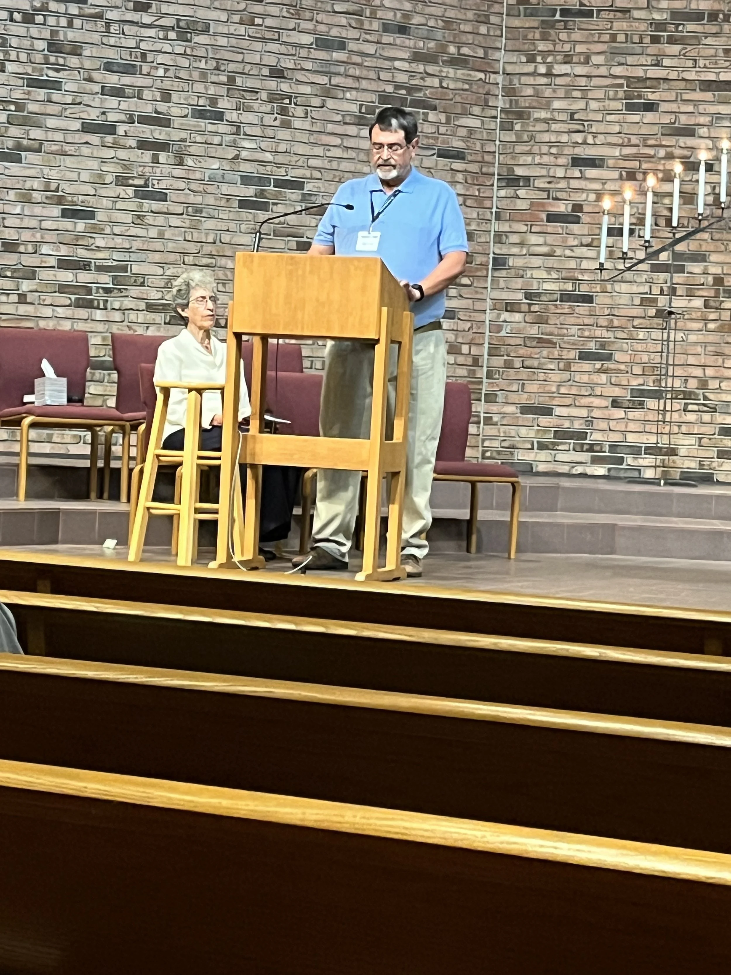 Jeff introducing guest speaker, Betsy Lozoff (seated), from the Berrien County Immigration Solidarity Network (BISN)